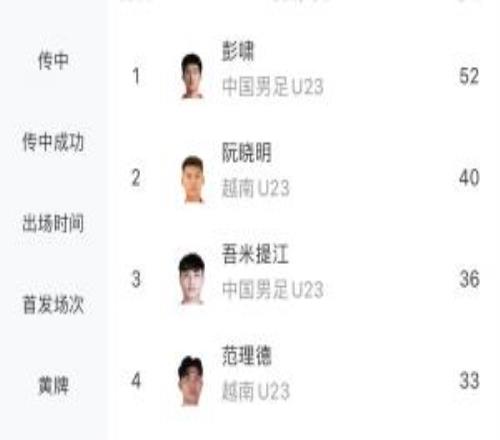 U23亚洲杯解围榜:彭啸52次独占第一,领先其他人至少12次