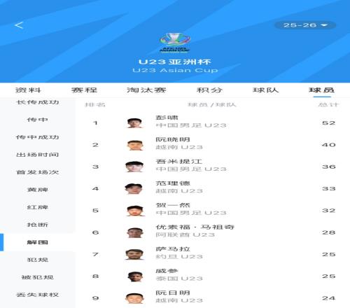 体育播报1月21日宣U23亚洲杯,U23国足3-0击败越南U23,成功晋级决赛。赛后,本届赛事数据更新,在赛事解围次数榜单上,彭啸以52次领跑!